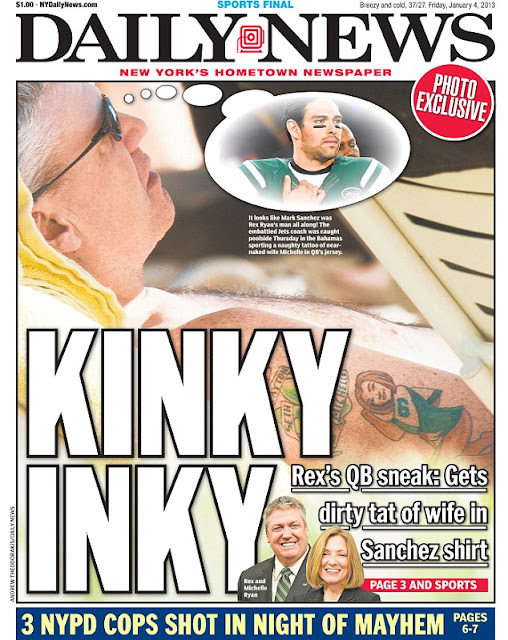 New York Jets coach Rex Ryan dons tattoo of his wife wearing nothing but the Jets jersey of quarterback Mark Sanchez!