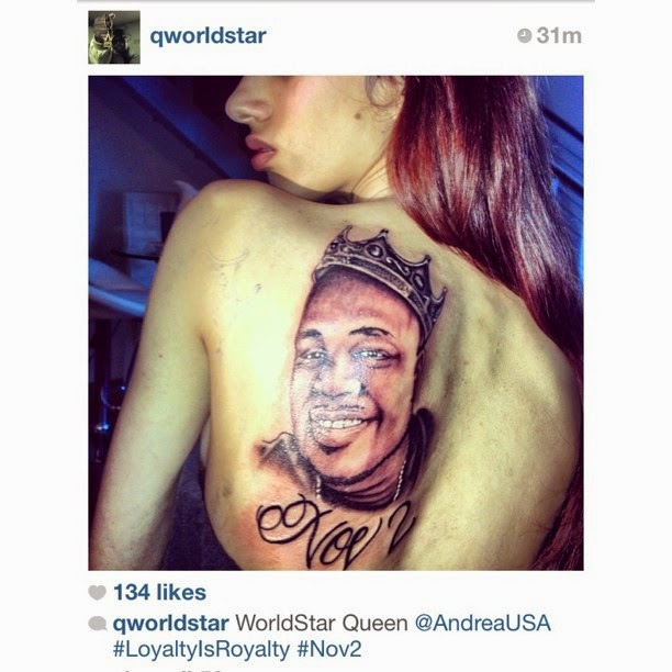 You know…. I am all for love…….. I am….. But getting a man’s face tatted on you anywhere on your body, just to show that your loyal is just dumb. Apparently Q and Kat have been rocking with each other since her release. He has been holding her down while locked up and once released, put her in a nice apartment in Miami and kept her pockets on point. Kat has deemed herself Queen of World Star… I really thought she got saved….